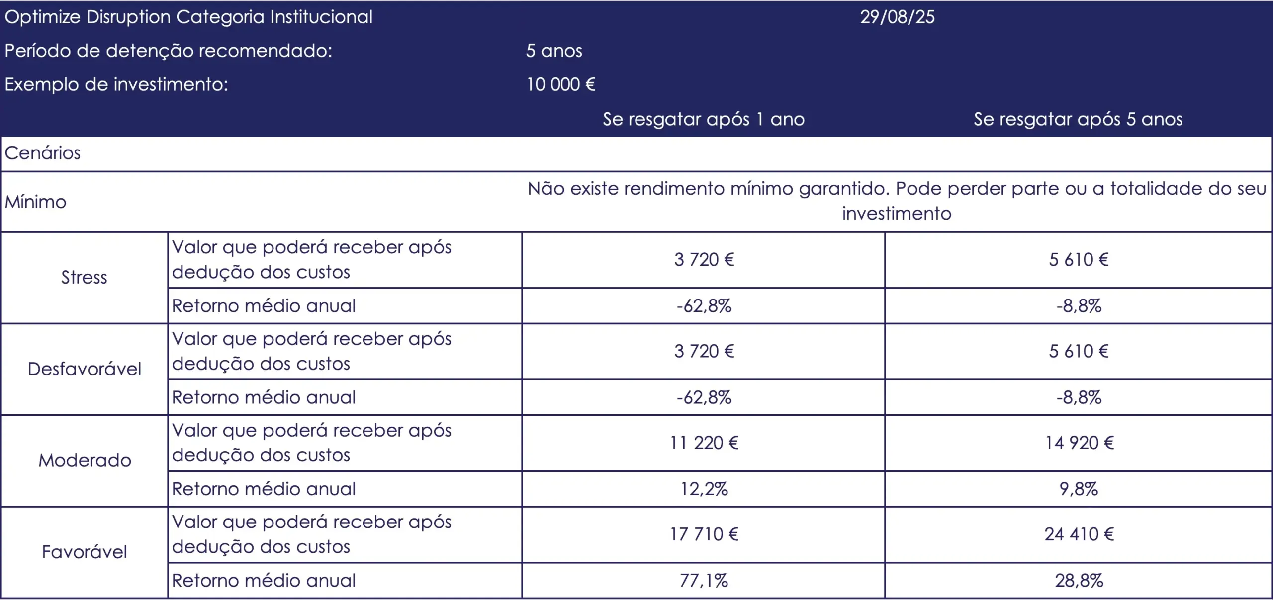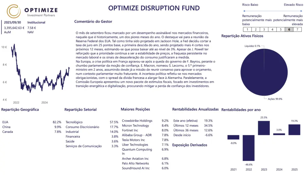As rentabilidades divulgadas representam dados passados e não constituem uma garantia de rentabilidade futura. O valor das unidades de participação pode aumentar ou diminuir em função do nível de risco que varia entre 1 (risco mínimo) e 7 (risco máximo). Os fundos geridos pela Optimize Investimento são fundos de investimento mobiliário, cujos prospetos completos e IFI se encontram disponíveis nas entidades comercializadoras. As taxas de rentabilidade mencionadas são líquidas de comissão de gestão e de depósito, de custos de auditoria e de taxa de supervisão. Os valores divulgados têm implícita a fiscalidade suportada pelo organismo de investimento coletivo e impende sobre o investidor o eventual pagamento de impostos sobre as mais-valias. O investimento no organismo de investimento coletivo pode implicar a perda do capital investido. As medidas de rentabilidade divulgadas só seriam obtidas se o investimento fosse efetuado durante a totalidade do período de referência e têm em conta o valor da UP a 30-09-2025.
