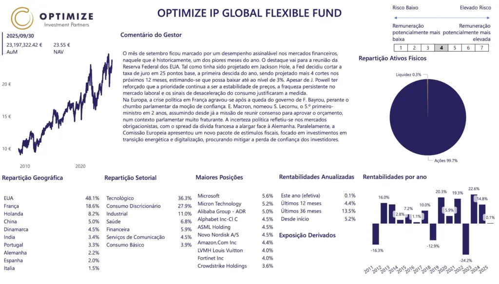 As rentabilidades divulgadas representam dados passados e não constituem uma garantia de rentabilidade futura. O valor das unidades de participação pode aumentar ou diminuir em função do nível de risco que varia entre 1 (risco mínimo) e 7 (risco máximo). Os fundos geridos pela Optimize Investimento são fundos de investimento mobiliário, cujos prospetos completos e IFI se encontram disponíveis nas entidades comercializadoras. As taxas de rentabilidade mencionadas são líquidas de comissão de gestão e de depósito, de custos de auditoria e de taxa de supervisão. Os valores divulgados têm implícita a fiscalidade suportada pelo organismo de investimento coletivo e impende sobre o investidor o eventual pagamento de impostos sobre as mais-valias. O investimento no organismo de investimento coletivo pode implicar a perda do capital investido. As medidas de rentabilidade divulgadas só seriam obtidas se o investimento fosse efetuado durante a totalidade do período de referência e têm em conta o valor da UP a 30-09-2025.