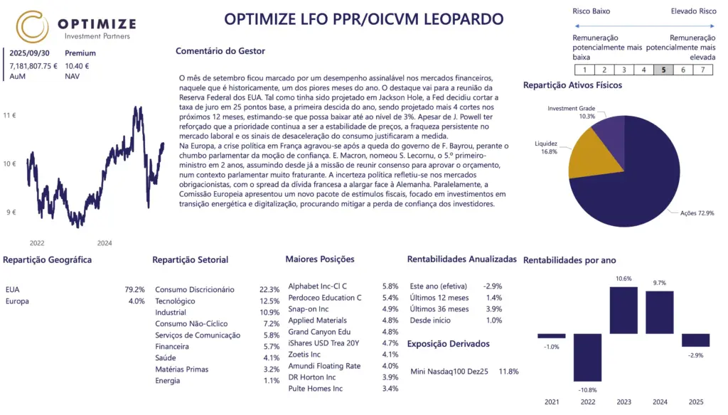 As rentabilidades divulgadas representam dados passados e não constituem uma garantia de rentabilidade futura. O valor das unidades de participação pode aumentar ou diminuir em função do nível de risco que varia entre 1 (risco mínimo) e 7 (risco máximo). Os fundos geridos pela Optimize Investimento são fundos de investimento mobiliário, cujos prospetos completos e IFI se encontram disponíveis nas entidades comercializadoras. As taxas de rentabilidade mencionadas são líquidas de comissão de gestão e de depósito, de custos de auditoria e de taxa de supervisão. Os valores divulgados têm implícita a fiscalidade suportada pelo organismo de investimento coletivo e impende sobre o investidor o eventual pagamento de impostos sobre as mais-valias. O investimento no organismo de investimento coletivo pode implicar a perda do capital investido. As medidas de rentabilidade divulgadas só seriam obtidas se o investimento fosse efetuado durante a totalidade do período de referência e têm em conta o valor da UP a 30-09-2025.