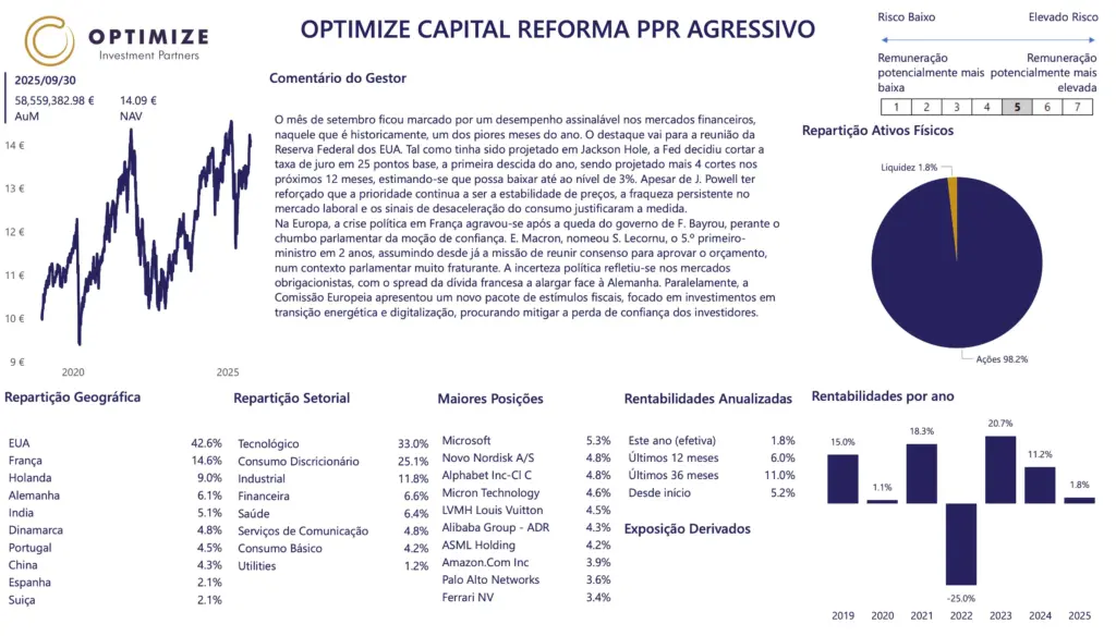 As rentabilidades divulgadas representam dados passados e não constituem uma garantia de rentabilidade futura. O valor das unidades de participação pode aumentar ou diminuir em função do nível de risco que varia entre 1 (risco mínimo) e 7 (risco máximo). Os fundos geridos pela Optimize Investimento são fundos de investimento mobiliário, cujos prospetos completos e IFI se encontram disponíveis nas entidades comercializadoras. As taxas de rentabilidade mencionadas são líquidas de comissão de gestão e de depósito, de custos de auditoria e de taxa de supervisão. Os valores divulgados têm implícita a fiscalidade suportada pelo organismo de investimento coletivo e impende sobre o investidor o eventual pagamento de impostos sobre as mais-valias. O investimento no organismo de investimento coletivo pode implicar a perda do capital investido. As medidas de rentabilidade divulgadas só seriam obtidas se o investimento fosse efetuado durante a totalidade do período de referência e têm em conta o valor da UP a 30-09-2025.